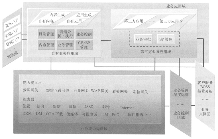 *業(yè)務(wù)能力提供區(qū):由于目前主要業(yè)務(wù)能力提供系統(tǒng)已實(shí)現(xiàn)接口的標(biāo)準(zhǔn)化,可采用邏輯上劃分應(yīng)用層和能力、資源層,并統(tǒng)一管理調(diào)用該能力提供功能的SP及用戶信息;