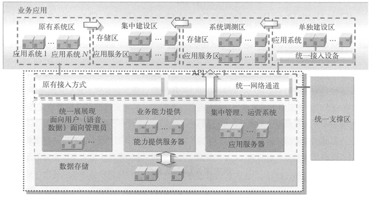 。5)應(yīng)用業(yè)務(wù)區(qū):統(tǒng)一搭建應(yīng)用硬件平臺,實(shí)現(xiàn)應(yīng)用業(yè)務(wù)區(qū)業(yè)務(wù)應(yīng)用及業(yè)務(wù)能力提供區(qū)接入通道類型的新增,均可直接在其硬件平臺上加載應(yīng)用軟件、提供服務(wù),調(diào)用現(xiàn)有資源實(shí)現(xiàn)。個別因?yàn)橄到y(tǒng)本身需求需要單獨(dú)建設(shè)、部署的系統(tǒng)則保留其單獨(dú)建設(shè)的方式。