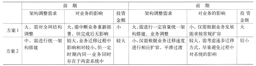 根據(jù)網(wǎng)絡(luò)演進(jìn)架構(gòu)清晰度、實(shí)施難度、投資金額等綜合因素考慮,對以上方案分析對比如表1所示。
