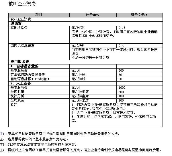 2、被叫企業(yè)資費標準如下: