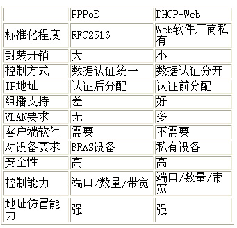 通過表1可以看出,DHCP+Web采用認證流和數(shù)據(jù)流相分離的方式,該方式?jīng)Q定了其對組播支持能力較強(只要局端設備支持),這種方式的帶寬利用率均較高,同時可以避免城域網(wǎng)匯聚層同時作為BRAS使用,對IPTV等寬帶業(yè)務非常適用。DHCP+Web方式可以對接入的用戶數(shù)量進行控制,由于采用Portal方式,其增值業(yè)務能力較強。從客戶端支持來看,由于DHCP+Web不需要客戶端軟件,避免了放號困難及維護工作量較大的問題?傮w而言,PPPoE技術成熟,效率低。