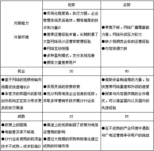 綜上所述,在我國IPTV市場上,電信運營商、廣電運營商、設備商、內容提供商等均面臨著激烈競爭,各企業(yè)必須培育起自己的核心競爭力,才能在該市場中占有一席之地。