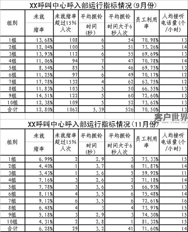 筆者所在呼叫中心從今年10月份開(kāi)始實(shí)行“四率管理”,以解決現(xiàn)場(chǎng)管理工作的存在的問(wèn)題,提高現(xiàn)場(chǎng)管理水平,提高服務(wù)效率。從統(tǒng)計(jì)數(shù)據(jù)看(見(jiàn)下表),實(shí)行“四率管理”后,呼叫中心的現(xiàn)場(chǎng)管理水平得到大幅提高,服務(wù)指標(biāo)增長(zhǎng)較快。在員工利用率基本保持不變的情況下,未就緒率、平均振鈴時(shí)間、每小時(shí)接聽(tīng)電話量等指標(biāo)均得到有效改善。其中,未就緒率從9月份的12.8%降低到6.3%,未就緒率低于15%的員工人次從1062次降低到29次;平均振鈴時(shí)間從5.4秒降低到3.2秒,平均振鈴時(shí)間大于6秒的人次從526人次降低到41人次。每小時(shí)人均接聽(tīng)電話數(shù)量從13個(gè)提高到14個(gè)。按8小時(shí)工作計(jì)算,每人每天接聽(tīng)電話數(shù)量增長(zhǎng)10個(gè)左右。具體統(tǒng)計(jì)數(shù)據(jù)見(jiàn)下表。