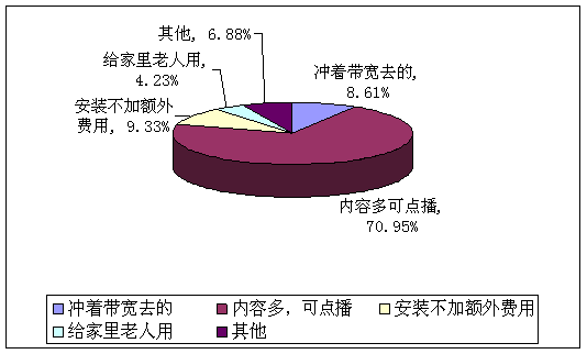 A、沖著帶寬去的(8.61%) B、內(nèi)容多,可點播(70.95%) C、安裝不加額外費用(9.33%) D、給家里老人用(4.23%)E、其他(6.88%)