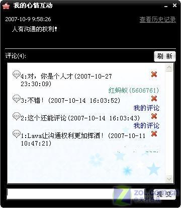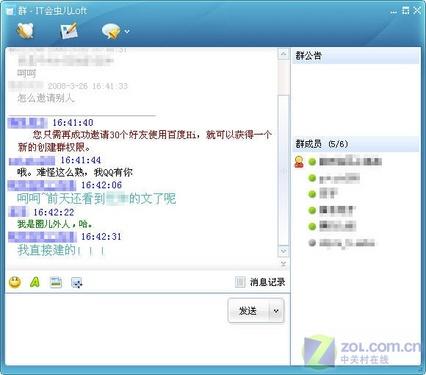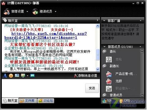 在群聊的過程中兩款軟件都各特色。百度Hi的特色是當用戶向群中一個不是自己好友的人發(fā)送信息時,該用戶會在百度網頁短信息中可以收到消息,此項功能十分適合上班時不能打開聊天軟件的朋友使用。Lava則是將群功能體現(xiàn)的更加強大些,除了消息發(fā)送外可以建立屬于群部落的文件庫,就是這個部落的藏寶室,有什么好東東都可以放進去,簡直就是超大的網絡硬盤。(圖9、圖10)