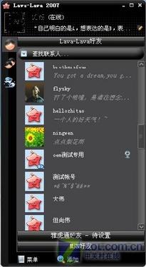 而Lava-Lava更是將整合功能發(fā)揮得淋漓盡致。上了Lava-Lava,還得惦記著MSN和雅虎通的好友,都登錄吧,不僅占用內存資源還嫌麻煩,現(xiàn)在不用再發(fā)愁了,新版lava不僅已經集成了MSN好友分組,還可以與雅虎通的好友互通,以后能在lava-lava上直接與MSN或雅虎通好友交流了。操作方法相當簡單,在你的主界面,添加MSN和雅虎通好友分組即可(圖14)。
