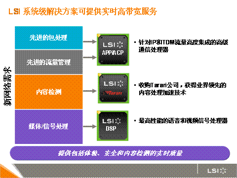 目前,只有很少的技術(shù)專家能夠向移動運營商提供推出這些新服務(wù)所需要的世界級解決方案。因為這需要技術(shù)提供者在通信網(wǎng)絡(luò)領(lǐng)域有著深厚的專業(yè)精深技能和高度的系統(tǒng)級解決方案能力。在通信帶寬和實時業(yè)務(wù)提供及系統(tǒng)靈活性存在矛盾時,系統(tǒng)設(shè)計的挑戰(zhàn)變得至關(guān)緊要。 在其他廠商為解決其中任何之一的技術(shù)問題而忙碌的時候,世界上有哪個公司可以利用系統(tǒng)的通信處理器綜合設(shè)計(包括通信1-7層)將帶寬,實時和靈活性三者完美結(jié)合,他便是最終的贏家。LSI就是這些少數(shù)技術(shù)專家之一。它能提供一整套解決方案來提供實時高帶寬服務(wù),包括高級網(wǎng)絡(luò)通信處理器、內(nèi)容檢測技術(shù)和DSP技術(shù)。