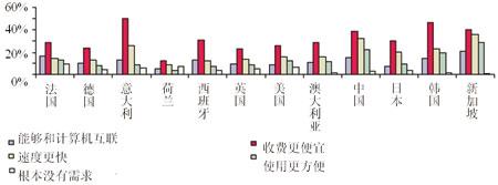 手機(jī)上網(wǎng)也受到一些用戶的歡迎,這得益于一些運(yùn)營商為促進(jìn)移動(dòng)互聯(lián)網(wǎng)的推廣而越來越多地采取了手機(jī)上網(wǎng)打包套餐。此外,不同地區(qū)的用戶對(duì)使用手機(jī)上網(wǎng)的偏好不同,調(diào)查顯示,亞洲國家用戶使用手機(jī)上網(wǎng)的比例高于歐洲國家用戶。其中,日本的被調(diào)查者通過手機(jī)上網(wǎng)的比例明顯超過平均水平,這離不開NTTDoCoMo公司i-Mode的成功。有意思的是,中國緊隨日本排名第二,這有可能是因?yàn)橐苿?dòng)通信在中國的普及率并不高,目前的用戶對(duì)技術(shù)的領(lǐng)悟能力大大超過了其它國家的平均水平,也有可能是因?yàn)橐恍┍徽{(diào)查者用手機(jī)替代了固定電話,手機(jī)成為其上網(wǎng)的惟一途徑(見圖3)。展望未來,Ovum認(rèn)為該領(lǐng)域充滿了期待。