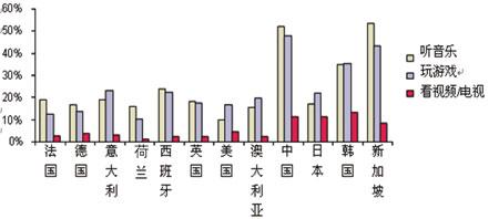 除打電話、發(fā)短信、拍照、手機(jī)郵箱以外,音樂、游戲也是用戶每周使用較多的業(yè)務(wù)。當(dāng)被問及其它應(yīng)用時(shí),來自中國、新加坡還有韓國的部分被調(diào)查者表示,他們會(huì)經(jīng)常用手機(jī)來聽音樂和玩游戲。其中,中國是惟一一個(gè)選擇用手機(jī)聽音樂的用戶數(shù)與選擇用手機(jī)拍照的用戶數(shù)旗鼓相當(dāng)?shù)膰。但有趣的是,手機(jī)在中國不太可能成為MP3的替代品,仍然只是一個(gè)便攜播放器。在新加坡,手機(jī)替代MP3的可能性就大多了。Ovum認(rèn)為,這是由于高端手機(jī)在新加坡市場(chǎng)占有很高的比例。在歐洲和美國,使用手機(jī)來聽音樂和玩游戲的比例則比亞洲少了很多,但值得鼓勵(lì)的是仍有超過10%的被調(diào)查者選擇了該答案。(見圖2)