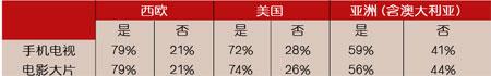 在被問及每月愿意花多少錢來收看手機(jī)電視和電影大片時(shí),歐洲和美國的被調(diào)查者表示出非常低的支付意愿。在歐洲,79%的被調(diào)查者不愿意為手機(jī)電視和電影支付費(fèi)用,美國的情況更糟糕,澳大利亞的回答則與歐洲的回答非常接近。在亞洲,59%的被調(diào)查者不愿為這些服務(wù)支付費(fèi)用。在日本,72%的被調(diào)查者不愿為手機(jī)電視付費(fèi),但是對(duì)于支付手機(jī)電影大片的反對(duì)率下降到了55%。(見表2)