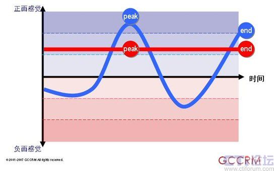 紅色情感曲線(xiàn)代表旨在提供全面理想體驗(yàn)的傳統(tǒng)方法。藍(lán)色情感曲線(xiàn)反映的是一種資源分配的新方法,它專(zhuān)注于峰值和終了這兩個(gè)關(guān)鍵點(diǎn)同時(shí)將剩余子流程的表現(xiàn)控制在平均水平之下。看似效率較低的那個(gè)(藍(lán)色情感曲線(xiàn))