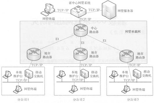 同樣以移動網(wǎng)為例,例子中移動交換機到維護終端支持TCP/IP方式,分公司具有本地維護終端和網(wǎng)管終端兩種類型的維護臺。本地維護終端通過以太交換機直接與移動交換機相連;網(wǎng)元和網(wǎng)管終端通過以太網(wǎng)接入邊緣路由器,經(jīng)路由器接.el轉(zhuǎn)化以El方式接入到時隙抽取設備中,由于傳送網(wǎng)管信息占用帶寬較小,
