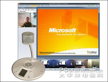 微軟Office RoundTable,音頻-視頻協(xié)作設(shè)備,帶有一個(gè)獨(dú)特的 360 度相機(jī)。在結(jié)合 Office Communications Server 2007 使用時(shí),RoundTable 還可交付卓越的會(huì)議體驗(yàn):將會(huì)議環(huán)境擴(kuò)展到多個(gè)位置,F(xiàn)場及遠(yuǎn)程位置的與會(huì)人員可以全景查看會(huì)議室中的每位成員,還可以在輪流發(fā)言時(shí)拉近特寫某個(gè)與會(huì)者。