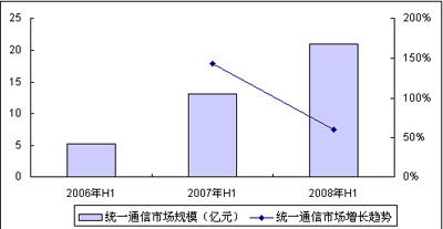 統(tǒng)一通信作為一種以融合技術(shù)為基本特征的特定解決方案和應(yīng)用,通過對各種溝通方式進行有效的融合,滿足用戶方便快捷的信息獲取和溝通需求,近年來在全球范圍內(nèi)得到了迅猛發(fā)展,各大通信與信息技術(shù)相關(guān)廠商紛紛加入統(tǒng)一通信市場的競爭中。賽迪顧問數(shù)據(jù)統(tǒng)計顯示,2008年上半年,中國統(tǒng)一通信整體市場規(guī)模已達到21.01億元,同比增長超過60.9%,繼續(xù)保持強勁的增長勢頭。