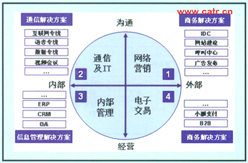企業(yè)客戶對電信服務(wù)的需求,集中體現(xiàn)為實現(xiàn)企業(yè)商業(yè)過程的綜合通信信息整體服務(wù),具體可以按縱向溝通、經(jīng)營和橫向內(nèi)部、外部分為四部分:內(nèi)部員工溝通、內(nèi)部經(jīng)營管理、外部客戶營銷以及產(chǎn)品銷售實現(xiàn)。與之相對應(yīng)的需求如圖2所示。
