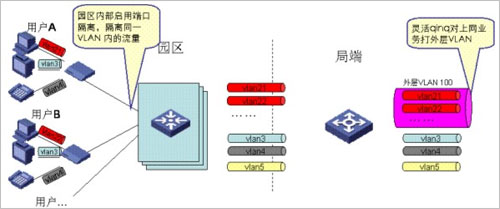 考慮到業(yè)務(wù)特性,上網(wǎng)業(yè)務(wù)通常需要對用戶進行精細化管理,而對IPTV業(yè)務(wù)通常采用較粗獷的管理模式,因此我們建議通過如下方式來做VLAN規(guī)劃:對上網(wǎng)業(yè)務(wù),采用PUPV(每用戶一VLAN),對于IPTV/VOIP業(yè)務(wù),采用PSPV(每業(yè)務(wù)一VLAN),即同一園區(qū)內(nèi)的IPTV用戶采用同一VLAN,不同園區(qū)的IPTV/VOIP用戶采用不同的業(yè)務(wù)VLAN,在局端,通過靈活QINQ對上網(wǎng)業(yè)務(wù)的VLAN打外層標簽,對于IPTV業(yè)務(wù)的VLAN不打外層標簽。