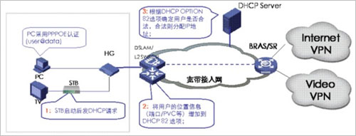 當網(wǎng)絡(luò)設(shè)備收到STB的DHCP請求報文時,需要在報文后添加OPTION82字段,此時有兩種模式進行DHCP+認證,一種是直接把DHCP報文送給DHCP服務(wù)器,由DHCP服務(wù)器根據(jù)OPT82字段來判斷該用戶是否為合法用戶,從而決定是否為其分配IP地址。另一種是DHCP報文先送到BRAS,由BRAS將OPT82字段放到RADIUS的一個子域里,通過RADIUS服務(wù)器來進行用戶合法性認證,若用戶合法,再由DHCP服務(wù)器分配IP地址。