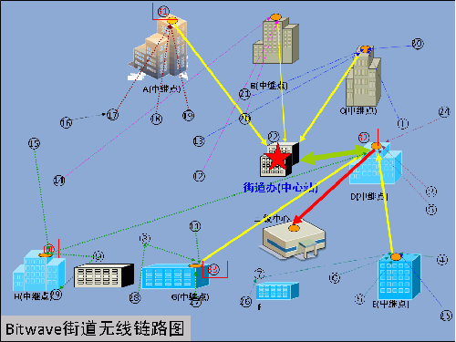例如,遠(yuǎn)端地面點(diǎn)與主控中心有樓房、樹(shù)木等障礙物遮擋,Bitwave采用中繼的模式,在遠(yuǎn)端地面點(diǎn)和中心點(diǎn)都可視的高點(diǎn)建筑物上架設(shè)一收一發(fā)的兩臺(tái)BWB210無(wú)線網(wǎng)橋,通過(guò)功分器或交換機(jī)將遠(yuǎn)端點(diǎn)的信號(hào)傳送到中心點(diǎn),很好的解決了遠(yuǎn)端點(diǎn)與中心點(diǎn)不可視情況下鏈路無(wú)法搭建的問(wèn)題。