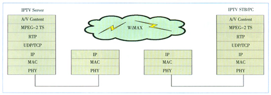 圖3是IPTV的傳播協(xié)議棧。語音視頻內(nèi)容首先經(jīng)過壓縮編碼(大多采用MPEG-2),然后使用實時傳輸協(xié)議(RTP)封裝,得到的載荷使用UDP或者TCP封裝成IP層的有效載荷,最后經(jīng)過IP協(xié)議和以太網(wǎng)802.3協(xié)議封裝后在核心網(wǎng)絡中傳播。核心網(wǎng)邊緣的WiMAX基站在收到802.3協(xié)議包后,基站的MAC層解封裝該包,去除以太網(wǎng)協(xié)議頭,再封裝成802.16協(xié)議的MAC層分組數(shù)據(jù)單元和PHY層數(shù)據(jù)單元。物理層采用前向糾錯編碼(FEC)、符號映射和OFDM調(diào)制等技術為數(shù)據(jù)單元準備無線空中連接。無線電收發(fā)器通過天線再把信號發(fā)送給SS或BS。當SS和BS接收到信號后,通過上面過程的逆過程,把信號還原為用戶需要的語音視頻內(nèi)容。
