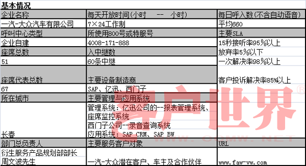 目前一汽-大眾旗下有奧迪、大眾兩個(gè)品牌,涉及十幾種汽車(chē)產(chǎn)品,全部由呼叫中心通過(guò)4008 171 888和0431-85990888兩個(gè)號(hào)碼來(lái)統(tǒng)一服務(wù)。一汽-大眾呼叫中心為了提高客戶滿意度,把座席分成奧迪、大眾兩個(gè)品牌獨(dú)立服務(wù);熱線電話的IVR設(shè)置分為一層,奧迪請(qǐng)按“1”,大眾請(qǐng)按“2”,提供清晰便捷的服務(wù),為客戶提供售前咨詢、售后咨詢、售前投訴、售后投訴服務(wù);結(jié)構(gòu)清晰而且采用主動(dòng)服務(wù)和客戶關(guān)愛(ài)的服務(wù)理念。為了最大限度接通每一通電話,將呼損率作為部門(mén)的KPI績(jī)效指標(biāo)。并不斷的提升整體服務(wù)水平。