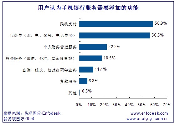 《2008年中國(guó)個(gè)人網(wǎng)上銀行市場(chǎng)用戶(hù)調(diào)研報(bào)告-手機(jī)銀行》研究發(fā)現(xiàn),用戶(hù)認(rèn)為手機(jī)銀行需要添加的功能主要為購(gòu)物支付和代繳費(fèi),分別占58.9%和56.5%。