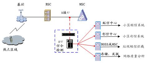 A口信令檢測的應(yīng)用非常廣泛,如網(wǎng)絡(luò)質(zhì)量分析系統(tǒng)、小區(qū)短信、小區(qū)彩信、垃圾短信攔截等。這些正成為通信運營商的業(yè)務(wù)增長點。其業(yè)務(wù)應(yīng)用組網(wǎng)圖如下: