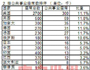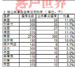 美國擁有全世界最多的座席,達(dá)到270萬個,公共事業(yè)座席30萬個,占11.1%;除美國以外,公共事業(yè)類座席總數(shù)排名在第2~6名的依次是:英國,加拿大,德國,法國,俄羅斯。