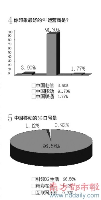 1、中國移動的3G口號是?超過98%的被訪者選擇了“引領(lǐng)3G生活”這一正確選項。2、你是否考慮升級到3G手機?選擇“會升級”的接近80%。如果考慮升級到3G手機,你最想使用哪家運營商的服務(wù)?中國移動奪得了超過九成的選票。但當(dāng)最后問到,“你印象中,中國移動的3G標(biāo)準是?”時,正確選項T D -SCD M A的得票率竟只有三成左右。