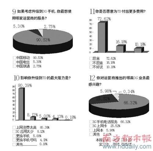 調(diào)查數(shù)據(jù)還顯示,68%的用戶希望今年年底就能升級到3G。在用戶升級阻力中,80%來自于對資費過高的擔(dān)心,其次是擔(dān)心應(yīng)用太少,占8%;阻力來自于更換手機和更換手機號碼的只有5%和4%。