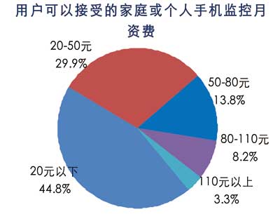 諾達(dá)咨詢調(diào)查數(shù)據(jù)表明,用戶可以接受的手機(jī)監(jiān)控月資費(fèi)以20元以下居多,占45%,其次20-50元占30%,50-80元占14%。