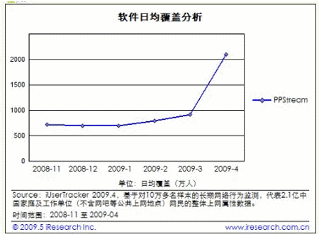 近日,艾瑞四月P2P流媒體數(shù)據(jù)出爐,PPS繼三月登頂后再次衛(wèi)冕成功。然而與三月相比較,PPS在短短一個月內(nèi)日均覆蓋人數(shù)從910.8萬人暴漲至2093.3萬人,令人乍舌的“驚變”引起了業(yè)內(nèi)人士甚至廣告主的密切關注。