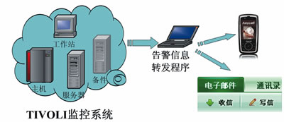在具體實(shí)施上,為了形成統(tǒng)一的體系以方便監(jiān)控并達(dá)到告警信息與實(shí)時(shí)的反饋,可將以上4個(gè)層面因素納入IBM公司開發(fā)的TIVOLI監(jiān)控系統(tǒng)。除此之外,為實(shí)現(xiàn)告警信息的自動(dòng)推送與分發(fā),可將自行開發(fā)告警信息轉(zhuǎn)發(fā)程序接入TIVOLI監(jiān)控系統(tǒng)信息庫(kù)。一旦檢測(cè)到異常信息存在則立即進(jìn)行短信或郵件的發(fā)送,確保維護(hù)人員及時(shí)了解接口系統(tǒng)運(yùn)行情況。整個(gè)過程如圖2所示。