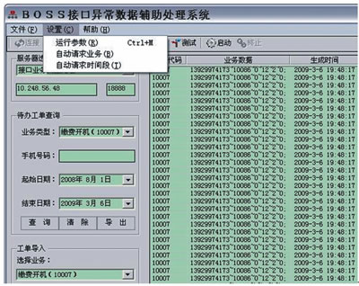 利用BOSS接口異常數(shù)據(jù)輔助處理系統(tǒng)執(zhí)行以上應(yīng)急流程的方式是:在提取號(hào)碼后,根據(jù)客服協(xié)議開機(jī)命令字10007格式要求(HandsetNo~工號(hào)~返回格式~nCode~sType~備注),將批量號(hào)碼構(gòu)造成報(bào)文列表并導(dǎo)入系統(tǒng)執(zhí)行。主界面如圖5所示。