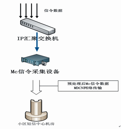 在軟交換模式下,在不影響信令傳輸?shù)那疤嵯,小區(qū)短信系統(tǒng)通過對Mc接口(MGW與MSCServer之間)進(jìn)行IP數(shù)據(jù)采集,替代采集A接口七號信令數(shù)據(jù),對采集到的Mc接口數(shù)據(jù)進(jìn)行分析、合成,獲取到小區(qū)短信平臺所需的重要、關(guān)鍵數(shù)據(jù)。