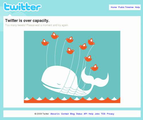 當(dāng)Twitter宕機(jī)或者訪問量超過負(fù)荷時(shí),用戶會(huì)被導(dǎo)向一個(gè)顯示有“失落的鯨魚”的頁(yè)面