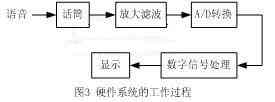 該系統(tǒng)以TMS320VC5402為核心電路,對(duì)孤立詞語(yǔ)音信號(hào)進(jìn)行采集和處理,AIC為T(mén)MS320VC5402的模擬接口電路,包括放大、濾波、和A/D轉(zhuǎn)換的電路,把由話筒采集進(jìn)來(lái)的模擬語(yǔ)音信號(hào),轉(zhuǎn)換成數(shù)字語(yǔ)音信號(hào)。其中SRAM和Flash分別為T(mén)MS 320VC5402的數(shù)據(jù)存儲(chǔ)器和程序存儲(chǔ)器。鍵盤(pán)和顯示部分則由AT89S52來(lái)控制,AT89S52把鍵盤(pán)操作轉(zhuǎn)換為控制信號(hào)再傳送給TMS320VC5402,控制系統(tǒng)的工作是訓(xùn)練還是識(shí)別,TMS320VC5402把要顯示的系統(tǒng)狀態(tài)通訊給AT89S52,以實(shí)現(xiàn)LCD顯示。這些硬件工作過(guò)程如圖3所示。