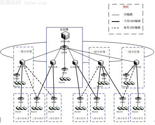 方案二:全集中式。在總前端集中部署若干臺視頻服務(wù)器,通過萬兆網(wǎng)絡(luò)直接向各分前端提供視頻流服務(wù);示意圖如下: