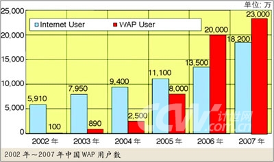 2002年~2007年中國(guó)WAP用戶(hù)數(shù)