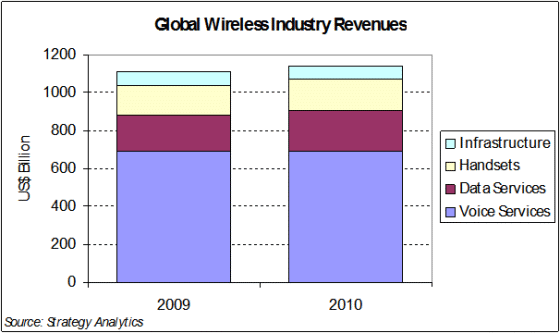 2009年,無線數(shù)據(jù)業(yè)務(wù)收入比上年增長了9.5%,支撐了行業(yè)總收入沒有下滑。Strategy Analytics預(yù)測(cè)2010年無線數(shù)據(jù)業(yè)務(wù)收入將增長13%,市場(chǎng)整體規(guī)模將超過2000億美元。