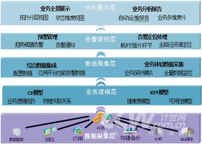 業(yè)務(wù)建模層: 是整個監(jiān)控系統(tǒng)的核心,是將業(yè)務(wù)進(jìn)行有形化管理、量化衡量的高效手段。該業(yè)務(wù)建模層中涵蓋了幾乎所有的BOSS管理資源要素,包括業(yè)務(wù)、應(yīng)用、服務(wù)及其他平臺類資源,這些信息都建立并實(shí)時更新于企業(yè)集中建設(shè)的符合ITIL標(biāo)準(zhǔn)的CMDB(配置資源數(shù)據(jù)庫,其中每一子項(xiàng)便是一個CI配置資源項(xiàng))中;贑MDB中動態(tài)調(diào)整的實(shí)時CI項(xiàng)和相互關(guān)系,關(guān)聯(lián)上能夠反映業(yè)務(wù)當(dāng)前狀況的KPI指標(biāo),以結(jié)構(gòu)化的模型框架為指導(dǎo),建立完整的業(yè)務(wù)CI/KPI指標(biāo)體系,繪制出以業(yè)務(wù)為中心的BOSS系統(tǒng)視圖,全面展現(xiàn)其健康度和可用性。