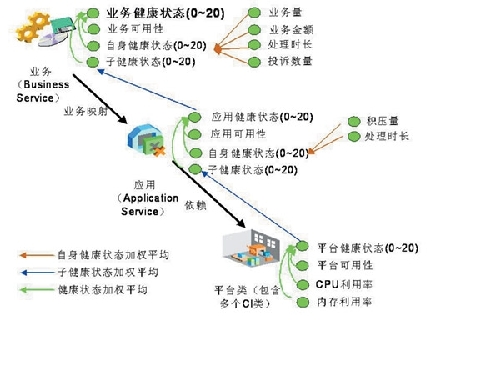 CI/KPI模型的建立,成功地將傳統(tǒng)監(jiān)控系統(tǒng)的監(jiān)控難點(diǎn)轉(zhuǎn)變?yōu)榱咙c(diǎn),通過對模型中父子業(yè)務(wù)間關(guān)系、業(yè)務(wù)與后臺資源間關(guān)系的結(jié)構(gòu)化梳理,多維度數(shù)據(jù)的采集計(jì)算,有效量化了業(yè)務(wù)健康度指標(biāo)。同時,模型中所綜合的業(yè)務(wù)可用性、業(yè)務(wù)辦理量、后臺資源使用情況等全方位信息,尤為適合公司管理人員了解業(yè)務(wù)通體運(yùn)營情況。