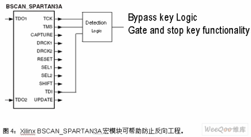 平臺(tái)中, 可在設(shè)計(jì)中使用BSCAN_SPARTAN3A宏模塊,其檢測(cè)邏輯可監(jiān)控FPGA構(gòu)造中的JTAG控制信號(hào),如圖4所示。如果檢測(cè)到JTAG控制信號(hào)的活動(dòng),用戶在設(shè)計(jì)可以立即繞過關(guān)鍵邏輯或關(guān)斷關(guān)鍵功能,不再執(zhí)行正確的功能。這樣反向工程人員讀到的將是不正確的功能模塊,在不能完成預(yù)期功能的解決方案上浪費(fèi)時(shí)間和資源。
