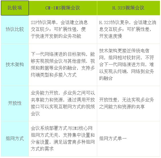 IMS是下一代網絡演進的核心技術,基于中國移動CM-IMS的視頻會議在全面支持語音、視頻、數(shù)據會議和高清會議功能的同時,有效解決了傳統(tǒng)H.323會議系統(tǒng)互通性差、終端要求高、業(yè)務可擴展性低等問題,成為中國移動視頻會議發(fā)展的主流技術。CM-IMS的視頻會議與傳統(tǒng)的H.323會議相比,具有以下技術優(yōu)勢: