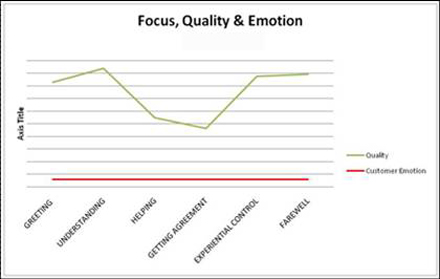 第二張圖片中客戶在很生氣的狀態(tài)下開始呼叫,而代理除了幫助階段外表現(xiàn)得都很好。該代理執(zhí)行的是最低績效標(biāo)準(zhǔn),但他對客戶的影響卻等于零。分析師提出了一個非常明顯而重要的關(guān)節(jié)——幫助是整個呼叫中最為重要的環(huán)節(jié)。這就是我們要做的事情。如果在幫助這一環(huán)上沒做好,那么其它環(huán)節(jié)如感謝客戶、問候客戶等等都變得無足輕重。
