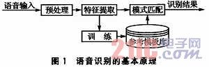 語音識別的基本原理如圖1所示。語音識別包括兩個階段:訓練和識別。不管是訓練還是識別,都必須對輸入語音預處理和特征提取。訓練階段所做的具體工作是通過用戶輸入若干次訓練語音,經(jīng)過預處理和特征提取后得到特征矢量參數(shù),最后通過特征建模達到建立訓練語音的參考模型庫的目的。而識別階段所做的主要工作是將輸入語音的特征矢量參數(shù)和參考模型庫中的參考模型進行相似性度量比較,然后把相似性最高的輸入特征矢量作為識別結(jié)果輸出。這樣,最終就達到了語音識別的目的。