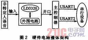 如圖2所示,硬件電路主要包括主控核心部分和語音識別部分。語音進入語音識別部分后,將處理過的數(shù)據(jù)并行傳輸?shù)街骺刂破,主控制器?jīng)過處理后,發(fā)送命令數(shù)據(jù)到USART,USART可用于擴展外圍串行設(shè)備,如語音合成模塊等。