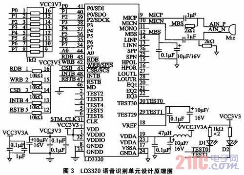 圖3為語音識別部分原理圖,參照了ICRoute發(fā)布的LD3320數(shù)據(jù)手冊進行設(shè)計。LD3320的內(nèi)部集成了快速穩(wěn)定的優(yōu)化算法,不需外接Fla-sh、RAM,不需要用戶事先訓練和錄音而完成非特定人語音識別,識別準確率高。