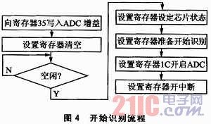③開始識別。設(shè)置幾個相關(guān)的寄存器,即可開始語音的識別。圖4是相關(guān)的流程。ADC通道即為麥克風輸入通道,ADC增益也就是麥克風音量,可設(shè)定值00H~7FH,建議設(shè)置值為40H~6FH,值越大代表MIC音量越大,識別啟動越敏感,但可能帶來更多誤識別;值越小代表MIC音量越小,需要近距離說話才能啟動識別功能,好處是對遠處的干擾語音沒有反應。本文中設(shè)定值為43H。