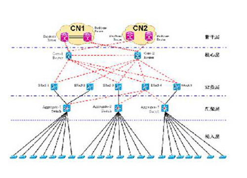 現(xiàn)在中國(guó)是世界上最大互聯(lián)網(wǎng)國(guó)家,我們國(guó)家有著最大的互聯(lián)網(wǎng)使用群體。據(jù)中國(guó)互聯(lián)網(wǎng)絡(luò)信息中心(CNNIC)發(fā)布的《第25次中國(guó)互聯(lián)網(wǎng)絡(luò)發(fā)展?fàn)顩r統(tǒng)計(jì)報(bào)告》數(shù)據(jù)顯示,截至2009年12月,我國(guó)網(wǎng)民規(guī)模已達(dá)3.84億,互聯(lián)網(wǎng)普及率進(jìn)一步提升,達(dá)到28.9%。據(jù)預(yù)測(cè),到2010年底,網(wǎng)民數(shù)量將超過5億。三大運(yùn)營(yíng)商在今年的寬帶用戶數(shù)數(shù)量近2億(1)。如此龐大的用戶規(guī)模群體對(duì)運(yùn)營(yíng)商網(wǎng)絡(luò)是一個(gè)嚴(yán)峻的考驗(yàn),F(xiàn)在的運(yùn)營(yíng)商網(wǎng)絡(luò),仍然是接入層,匯聚層和核心層三層架構(gòu)為主體,總的帶寬近40T。以中國(guó)電信集團(tuán)為例,運(yùn)營(yíng)商的現(xiàn)有IP骨干網(wǎng)絡(luò)架構(gòu)一般如下圖所示: