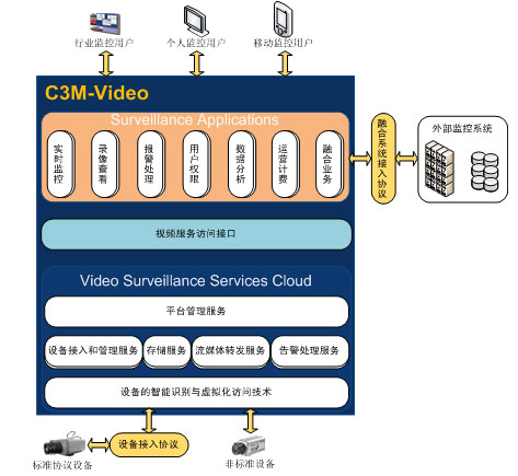 高新興通信最新推出基于云計(jì)算的C3M-Video視頻監(jiān)控管理平臺(tái),具有視頻監(jiān)控管理平臺(tái)的通用功能和業(yè)務(wù)流程,能支持國(guó)內(nèi)外主流的視頻設(shè)備。此外,能與高新興現(xiàn)有的動(dòng)力環(huán)境監(jiān)控系統(tǒng)進(jìn)行深度的融合,并以此為基礎(chǔ)逐步演繹成一個(gè)支撐物聯(lián)網(wǎng)應(yīng)用的融合監(jiān)控平臺(tái)。